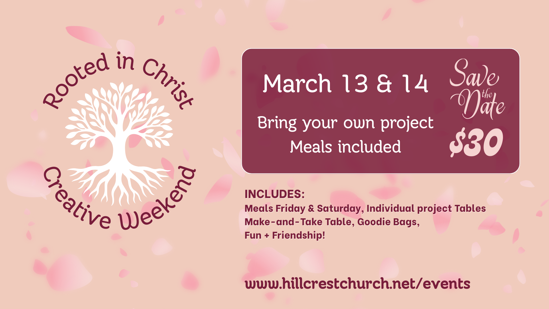 Have you been looking for an opportunity to dedicate some time to a creative project of your own? It could be sorting photos, making cards, crochet or knitting projects, quilting, painting, you name it! Friday, March 13th beginning at noon til 9pm and Saturday from 9am til 4pm we are making space for you! Book your table and we’ll supply the food and a themed break or two! If you have any questions, feel free to reach out to Michelle or Christy at the Church Office. Registration Deadline is March 11.
